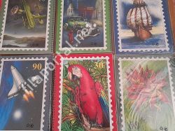 Gyári új, kiváló bélyegalbum, 10 fehér oldalas, oldalanként 9 csíkkal, és elválasztó pergamenekkel. A borítója szép, óriás bélyeget ábrázol. Stabil, komoly album, a legjobb bélyeggyűjteményekhez is ajánlott. Lásd a képet, a képeken láthatóak a borítók. A 3. képen láthtaó az 50 db os bélyegcsomag egy részlete. (ennek tartalma mindig válozik.)
