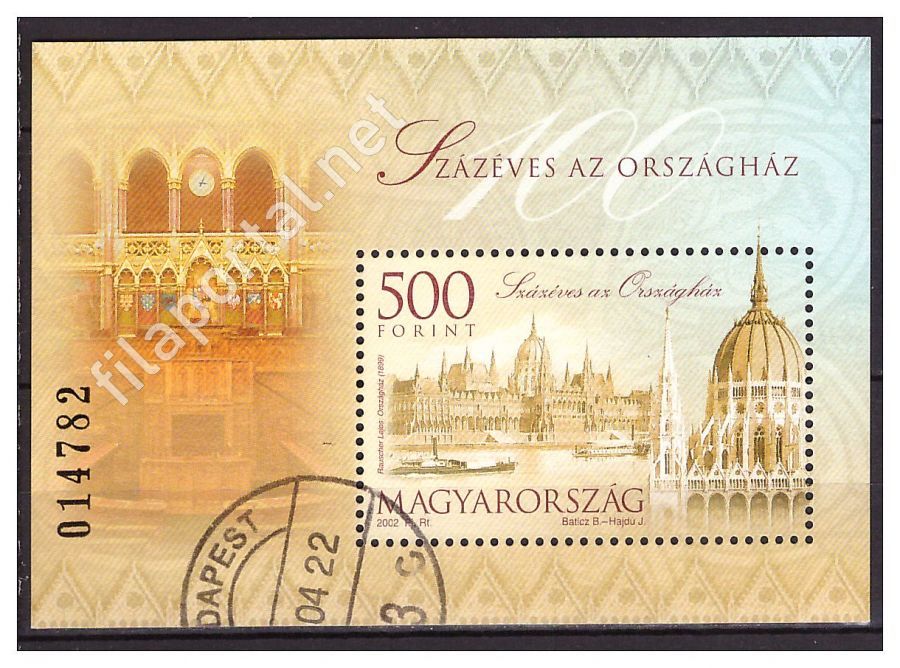 2002. 100 ÉVES AZ ORSZÁGHÁZ BLOKK 4635 -o- kat.ára 1.500 Ft, BUDAPEST bgző