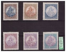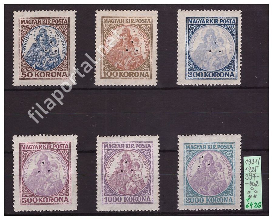 1921/25. KORONÁS MADONNA SOROZAT 397-402 ** hármaslyukkal (z6426f) szép sor, berakólapon