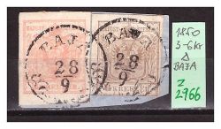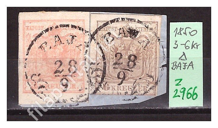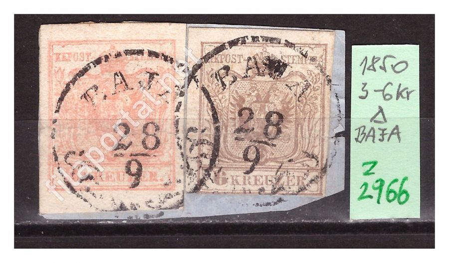 Szép kivágáson kétszínű 3+6 kr. bérmentesítés, BAJA E2.8 egykörös bélyegzések. Két egész bélyeggel, jó szegélyekkel. A kétszínű béremenetsítésre a fekete könyv 40 szeres szorzót ad, + 2 x 20 Gudlin pont.