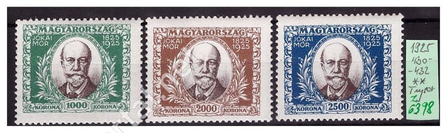 1925. JÓKAI MÓR sorozat 430-432 mindhátom bélyegen a fejkép hátoldali színátnyomata ** (z6398f)