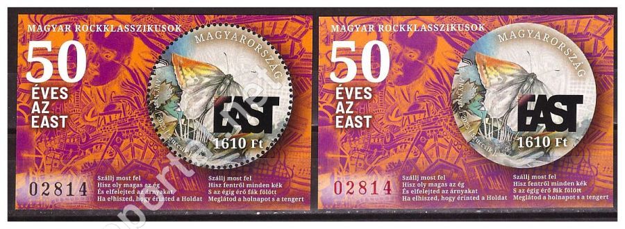 2025. MAGYAR ROCK KLASSZIKUSOK - blokkpár, 50 éves az EAST együttes ** fekete és piros azonos s.sz (perforált és vágott)