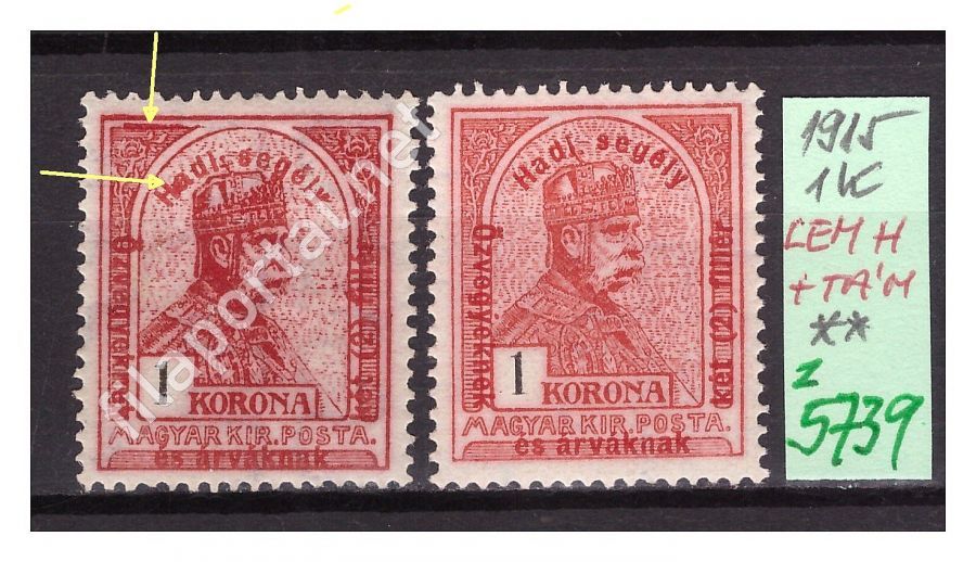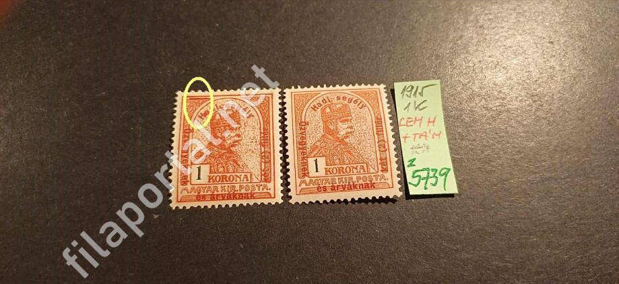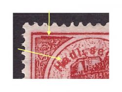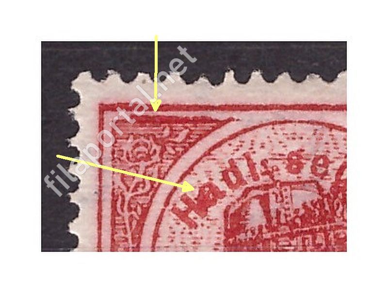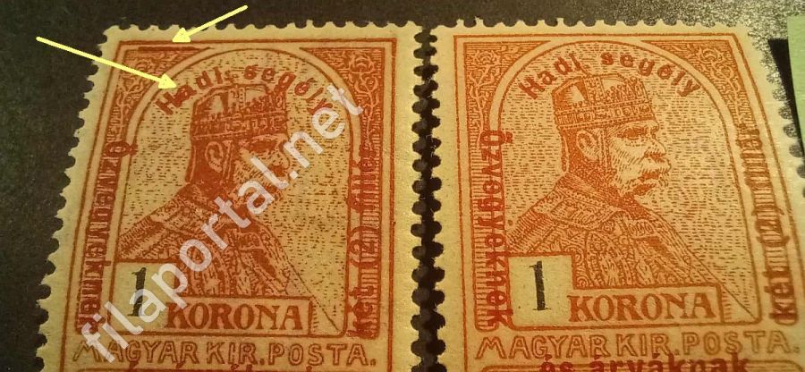 A baloldali bélyegen felül erős vörös csík, és a "Hadi" feliratban a H és a betű jókora festékfolttal "összeolvadt". Szép támpéldánnyal együtt.