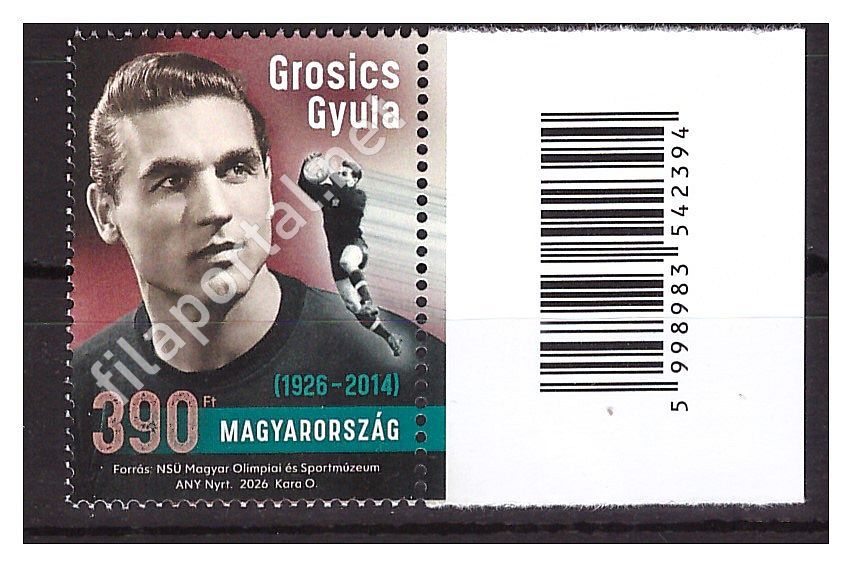 2026. 100 éve született GROSICS GYULA ** vonalkóddal (túlnyúló bélyegképpel)