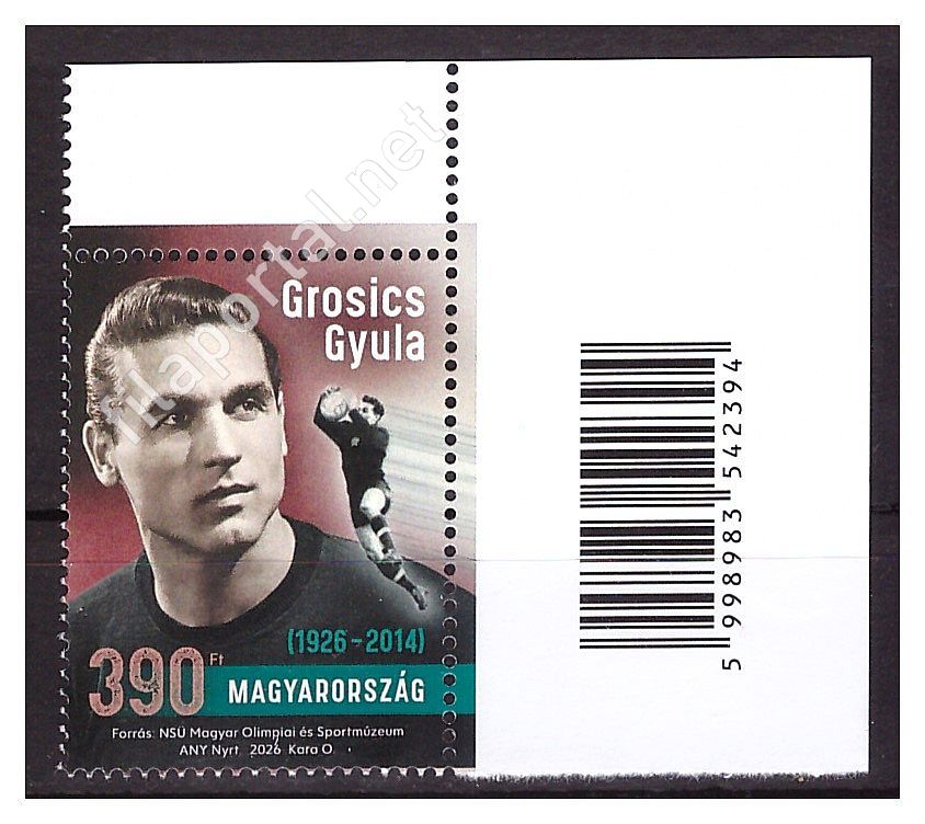 2026. 100 éve született GROSICS GYULA ** vonalkóddal (túlnyúló bélyegképpel) ívsarki, jobb alsó vagy felső