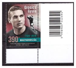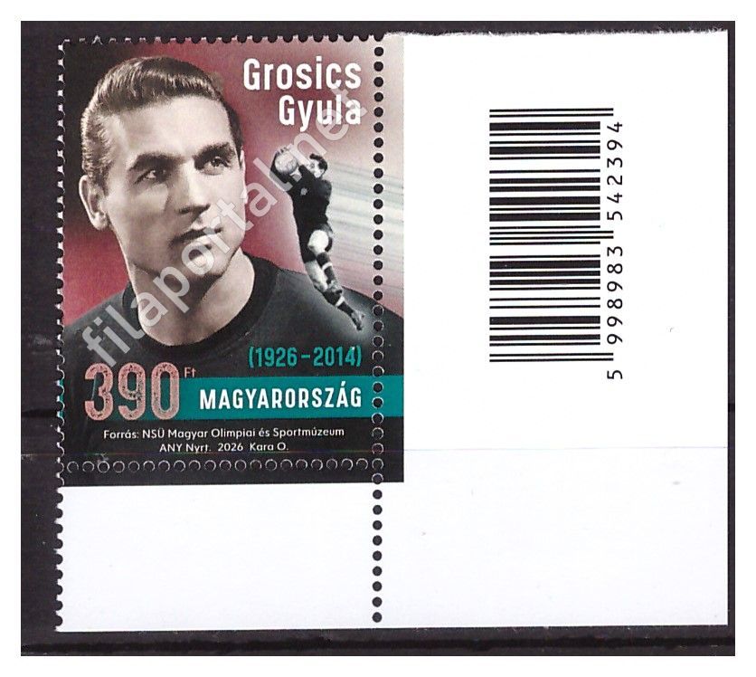 2026. 100 éve született GROSICS GYULA ** vonalkóddal (túlnyúló bélyegképpel) ívsarki, jobb alsó vagy felső